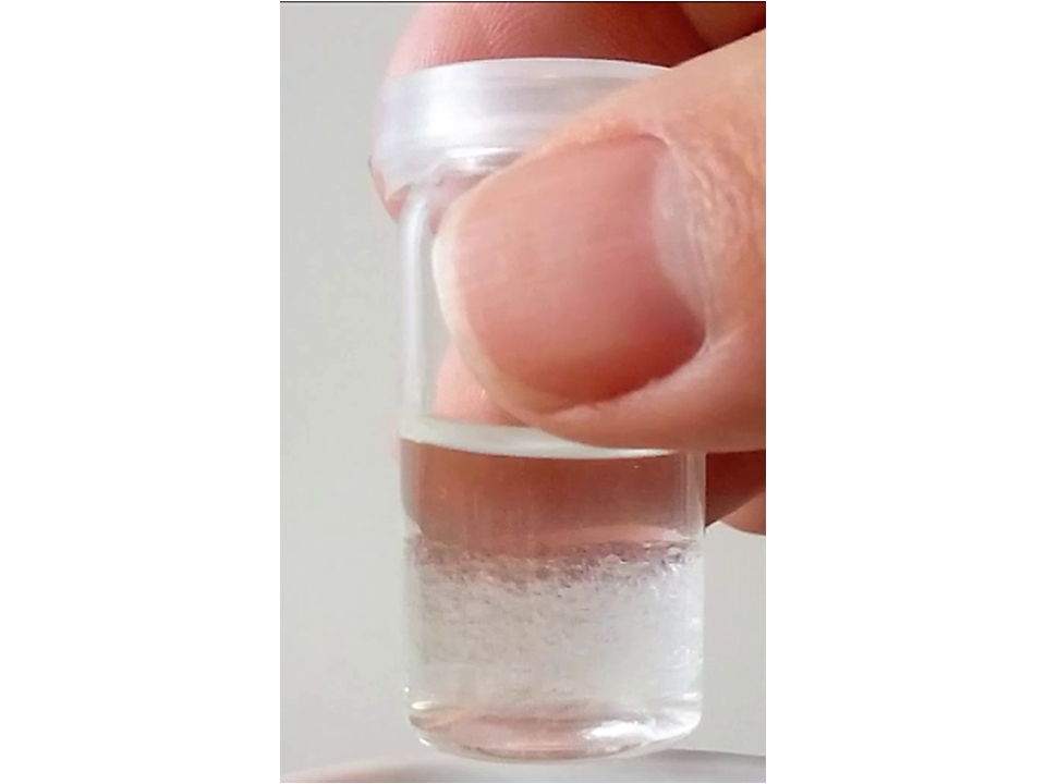 - Betrachten Sie zunächst das mit Heptan und Wasser gefüllte Gefäß. Schütteln Sie dann das verschlossene Gefäß kräftig für mehrere Sekunden. Stellen Sie es ab und beobachten Sie für 20 Sekunden.