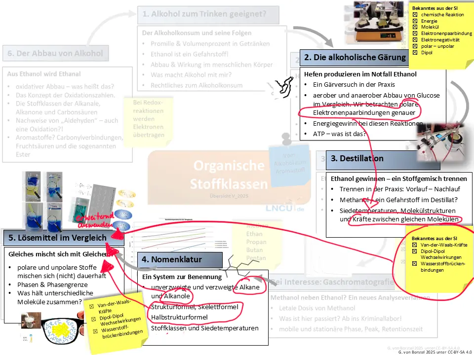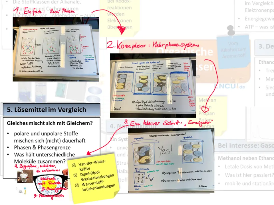 Ja, korrekt. Da ging es in der Regel um Wechselwirkungen zwischen gleichen Molekülen. Die selben Gedanken und Erklärungen können wir aber auch verwenden, wenn wir uns überlegen, warum die Moleküle verschiedener Stoffe (nicht) gut zusammenhalten.