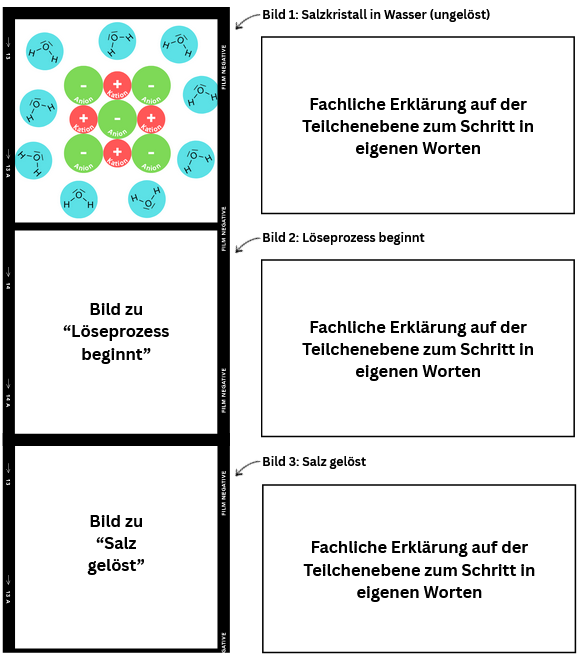 - Stelle erneut den Lösevorgang eines Salzes auf der Teilchenebene in Form einer Filmleiste dar.