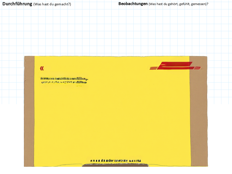 - Untersuche die Kiste. Schreibe bei „Durchführung“ auf, was Du gemacht hast. Schreibe bei „Beobachtung“ auf, was du gehört oder gefühlt hast.